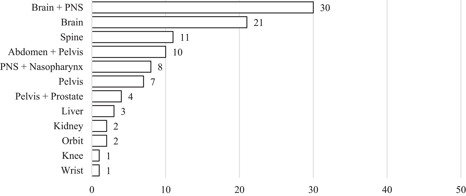 Among the 100 enrolled study patients, it was found that patients were most commonly referred for MRI of the brain and PNS (30%), closely followed by the brain (21%), spine (11%), abdomen or pelvis (10%) among others (28%). Fig. 1 depicts the analysis results.