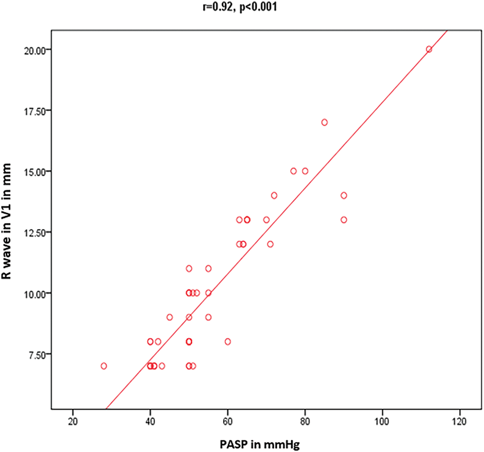 Fig. 1. Scatter plot diagram showing correlation between PASP and R wave in V1 among the study population.