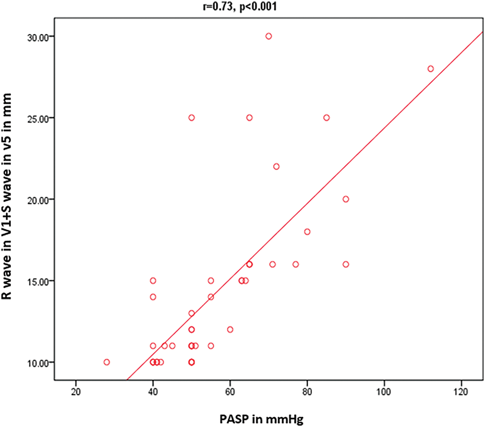 Fig. 2. Scatter plot diagram showing correlation between PASP and R wave in V1+ S wave in V5 among the study population.