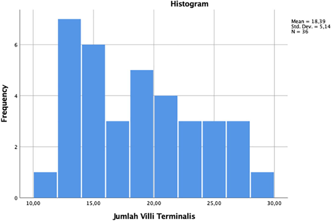 The results show that the intervention group had a mean of 22.22 with a range of 14.00, indicating a greater number of terminal villi compared to the control group (mean = 14.55). The standard deviation of the intervention group (3.81) was slightly higher than the control group (2.95), suggesting more variability, though the intervention group consistently exhibited a higher number of villi. The higher mean in the intervention group suggests that ozone therapy significantly increased the number of terminal villi compared to the control group.