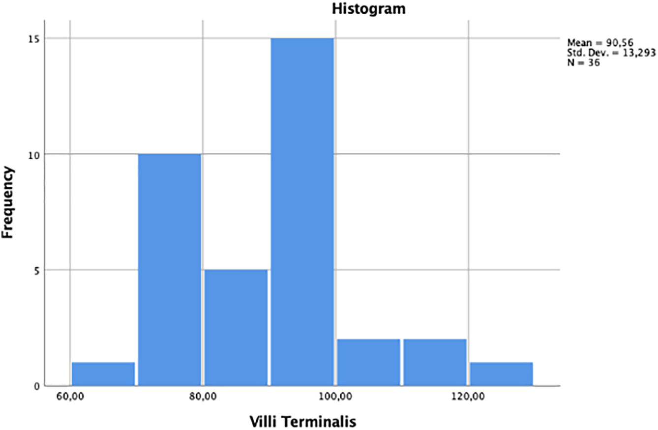 The Shapiro-Wilk test for the villus diameter data showed a statistic value of 0.964, with a significance value (p) of 0.289. Since p > 0.05, the data are normally distributed (Table VI), and no deviations from normality were observed. The histogram confirms that the villus diameter data are normally distributed, as the Shapiro-Wilk test indicated (Fig. 5).
