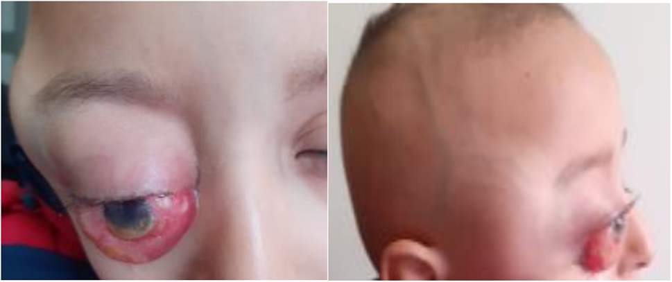 An ophthalmologist in the emergency room for a VAD and eye pain first saw the child. On examination, true exophthalmos with palpebral edema was found on the right. Cerebral and orbital CT revealed a right latero-orbital osteolytic mass of secondary appearance with endocranial extension. The workup showed lymph node involvement, unilateral right adrenal, osteomedullary, hepatic, and pancreatic involvement.