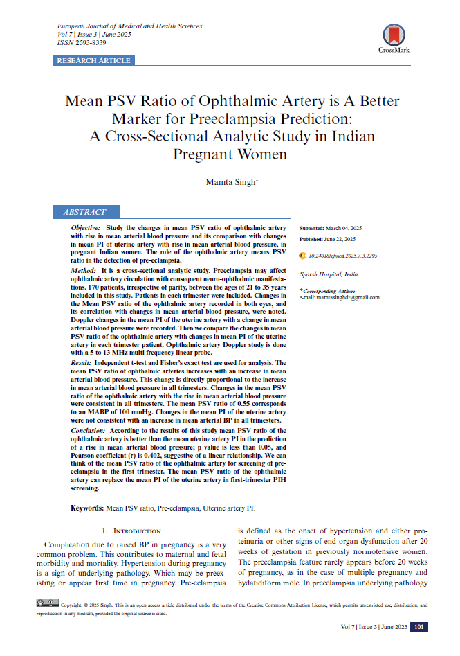 Singh M. Evaluation of maternal ophthalmic artery Doppler indices and its correlation with mean arterial blood pressure in pregnant Indian women: a cross-sectional observational study. Eur J Med Health Sci. 2024;6(5):77–82.