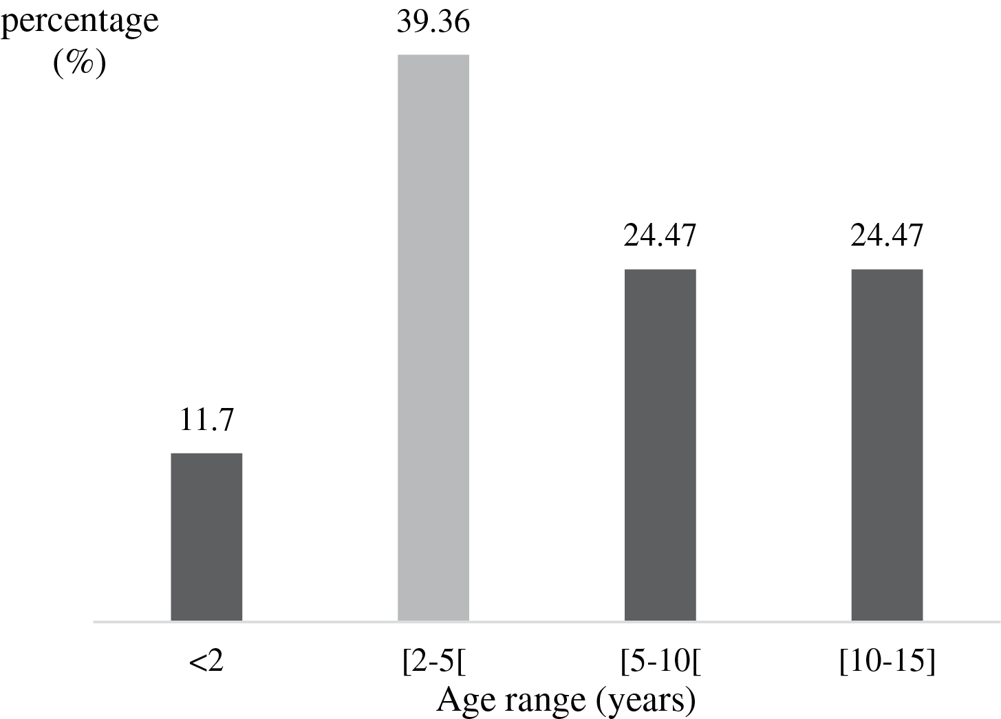 Out of 2438 children hospitalized, 94 (3.9%) presented with traumatic brain injury (Fig. 1). The mean age was 6.3 years, with a male predominance (59.57%). Falls were the primary etiology (65.15%), followed by road traffic accidents (23%), highlighting the importance of age-appropriate prevention measures. The mean Glasgow Coma Scale score was 13.5, with 62% of patients classified as mild TBI (Glasgow ≥ 13), 27% as moderate TBI (Glasgow 9-12), and 11% as severe TBI (Glasgow ≤ 8). The most common clinical signs were headaches (47%), vomiting (30%), and altered consciousness (25%). The presence of repeated vomiting was strongly correlated with intracranial lesions detected by CT (p = 0.02).