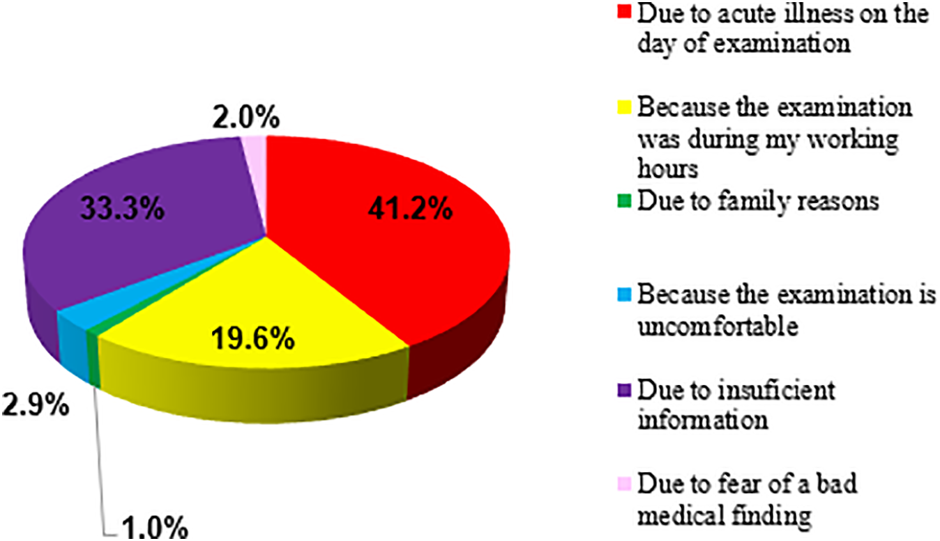 Of the 102 respondents, 94 (92%) responded to the invitation for NPP breast cancer screening. Only 14.7% of the participants had never given birth. Three-quarters of respondents were breastfed. Almost a quarter of the respondents (23.5%) reported a family history of malignant breast disease. Fig. 1 illustrates the main reasons for non-participation in the national breast cancer screening program. Most respondents (41.2%) did not take part in the examination because they were acutely ill on the day of the examination, and one in three respondents (33.3%) did not attend the examination because they were not sufficiently informed. The fewest respondents did not attend the examination because they were afraid of suffering from a malignant breast disease, because the examination was unpleasant, or for family reasons (Fig. 1).