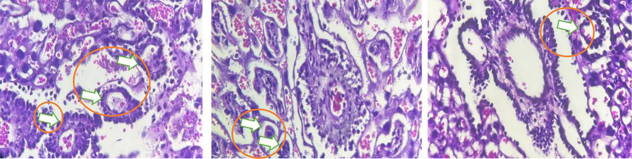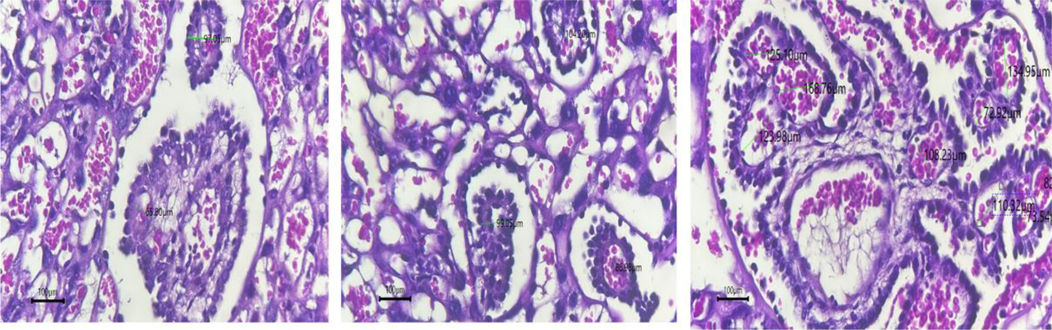 This image displays varying diameters of placental terminal villi, critical for gas and nutrient exchange. Terminal villi, resembling small fingers, consist of loose connective tissue and are covered by syncytiotrophoblasts, with visible blood capillaries enhancing exchange efficiency. Measurements of villous diameter ranged from 65.80 µm to 168.76 µm, reflecting the level of villous maturation and metabolic activity (Fig. 3).