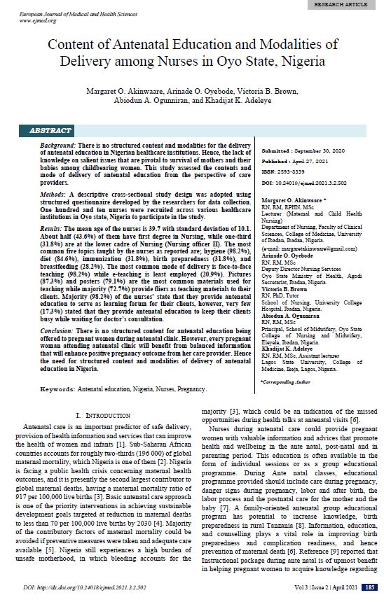 Content of Antenatal Education and Modalities of Delivery among Nurses in Oyo State, Nigeria