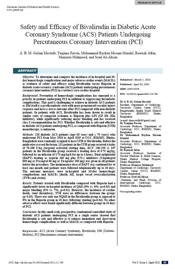 Methods: 218 diabetic ACS patients (age>18 years and ≤ 75 years) who underwent PCI from May 2018 to April 2019 at UCC, BSMMU, Dhaka, Bangladesh were randomly assigned to have UFH or Bivalirudin. Before the guide wire crossed the lesion, 111 patients in the UFH group received a bolus of 70-100 U/kg (targeted activated clotting time, ACT: 200-250 s). 107 patients in the Bivalirudin group received a loading dose of 0.75 mg/kg, followed by an infusion of 1.75 mg/kg/h for up to 4 hours. Dual antiplatelet (DAPT) loading as Aspirin 300 mg plus P2Y12 inhibitors (Clopidogrel 600 mg or Prasugrel 60 mg or Ticagrelor 180 mg) was given in all patients before the procedure. The maintenance dose of DAPT was continued for at least one month and patients were followed telephonically up to 30 days. The outcome measures were in-hospital and 30-day hemorrhagic complications and MACEs [death, MI, target vessel revascularization (TVR) and stroke].